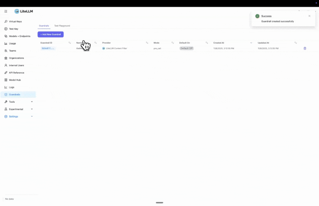 Click "Add New Guardrail" and select "LiteLLM Content Filter" as your guardrail provider.